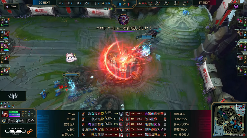 Day3のDC NEXTの相手は、SUPを務める本田翼さんの代わりに、ぶいすぽっ!の一ノ瀬うるはさんが出場したST NEXTでした。ST NEXTは、胡桃のあさんがヨリック(ta1yoさん)のカウンターピックとしてチョ=ガスを投入したほか、夢野あかりさんがダメージキャリーとしてスモルダーをピックするなどDC NEXTを意識したバンピックとなりました。