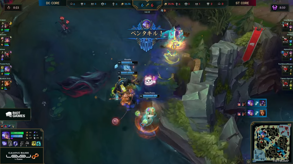 順調に主導権を握りながら試合を進めていたST COREですが、16分頃に起きたリフトヘラルドを巡る集団戦で天帝フォルテさんのペンタキルを決め手に、DC COREに逆転を許します。続く集団戦でも、ST COREはリリアのゾーニングやニーコのエンゲージなどに苦しめられ、思うように集団戦を進めることができず、DC COREがDay2に続き勝利を果たしました。
