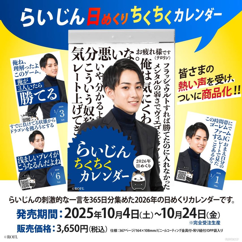 10月4日、ストリーマーコミュニティ「げまげま」が、『リーグ・オブ・レジェンド(LoL)』の配信などで生まれたらいじんさんの刺激的な一言を、365日分収録した「らいじん日めくりちくちくカレンダー」を発売。あまりの人気の高さに販売開始をしてからわずか1時間あまりで完売となりました。