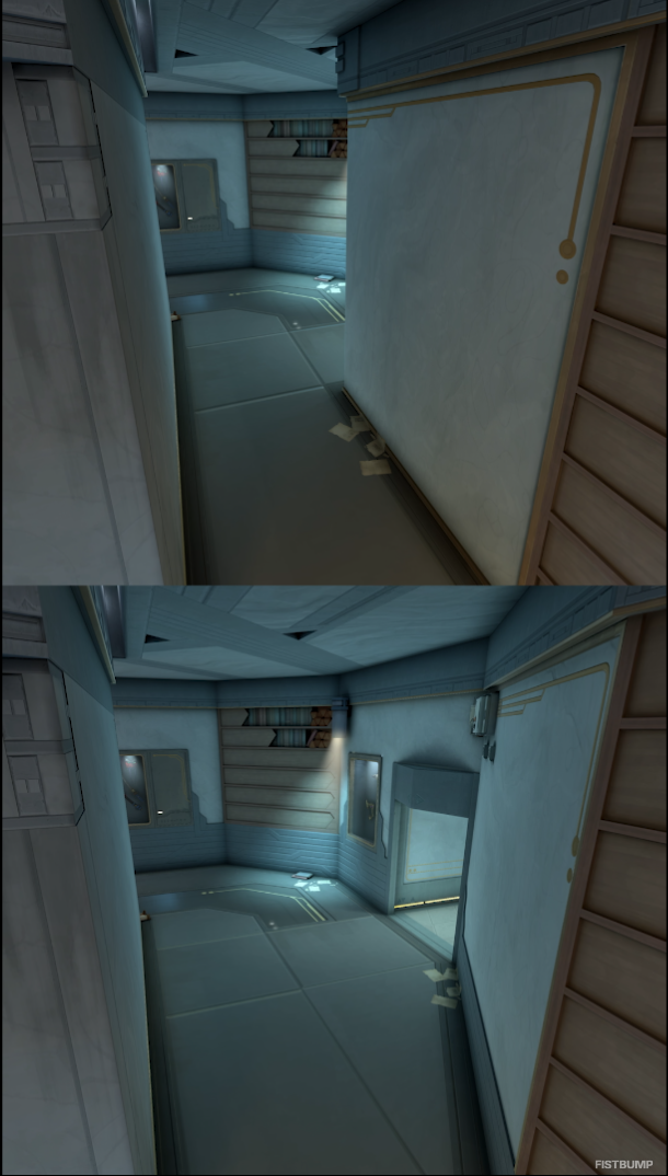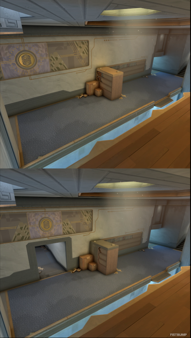 中央通路の変更点 - 両チームがルートについてのマクロな判断をより素早く下せるようにしたいと考えています。そこで、両チームともにマップ全体を移動しやすくなるよう、中央からB メインにつながる通路を改善しました。