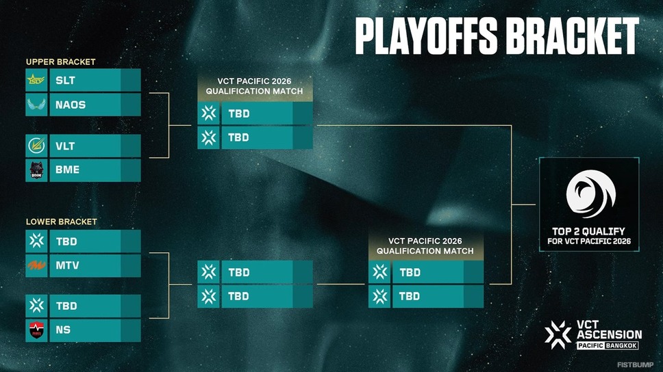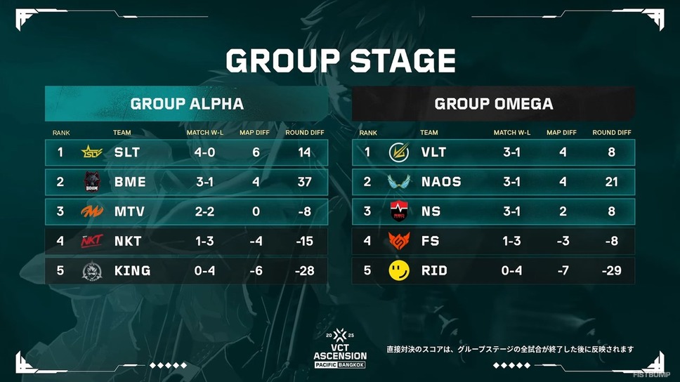 8日間にわたる各グループでの総当たり戦が終了し、各グループ上位3チームがプレイオフに進出。上位2チームがアッパーブラケット、残る1チームがローワーブラケットから戦います。プレイオフは10月22日から行われ、それぞれのブラケットファイナル(10月25日と26日)に勝利した計2チームがVCT Pacificに進出します。