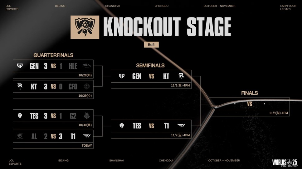 ノックアウトステージの準決勝は日本時間10月31日の16時からGen.G vs KTの試合が、11月1日の16時からTES vs T1の試合が予定されています。