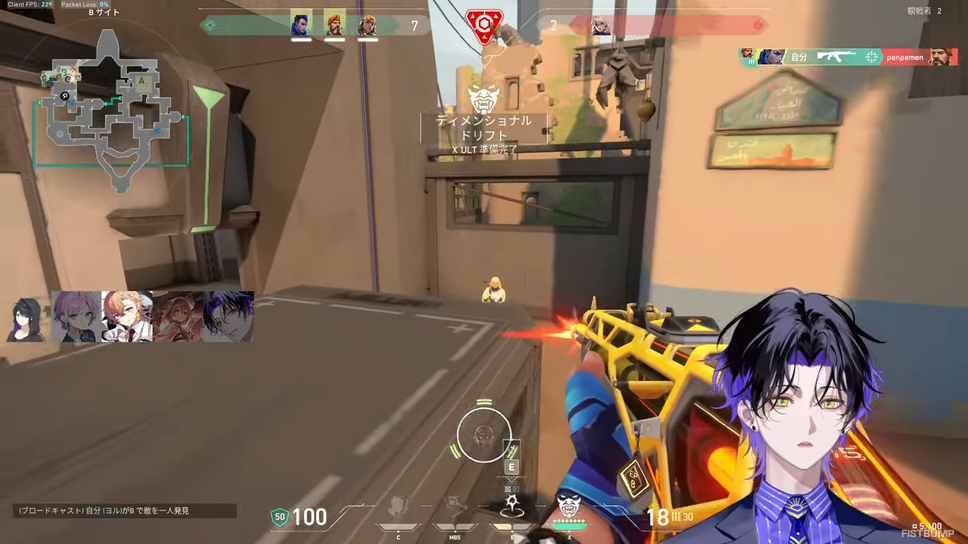 11月5日に行われた「V最」に出場するチーム8のスクリム中でもその高い実力を発揮。周りの状況報告を聞きながら射線の管理やフラッシュタイミングなども提案しつつ、キルも取得する活躍でチームに貢献しました。