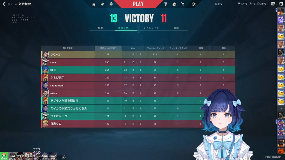 「VTuber最協決定戦 Ver.VALORANT Act2」のスクリムは、11月5日(水)から8日(土)かけて開催中です。11月9日(日)に本番が行われます。