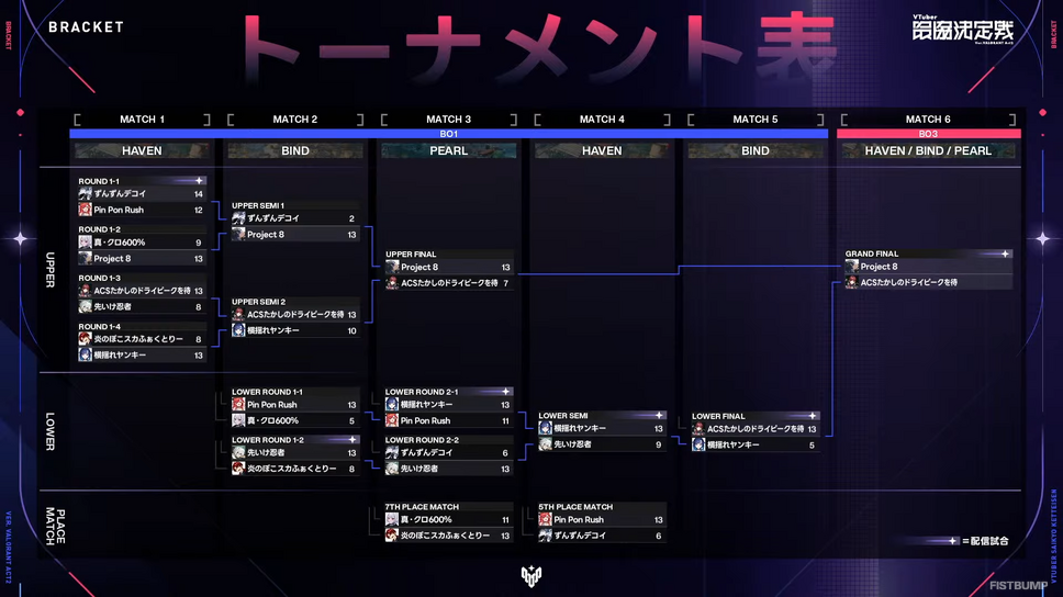 決勝では、アッパーブラケットをストレートで勝ち上がってきた「Project 8」と、ローワーファイナルで「横揺れヤンキー」に勝利してグランドファイナルへ駒を進めた「ACSたかしのドライピークを待っててすまないねぇ」が激突。試合の結果、1stマップ:バインドと3rdマップ:ヘイヴンで勝利した「Project 8」が優勝を収めました。