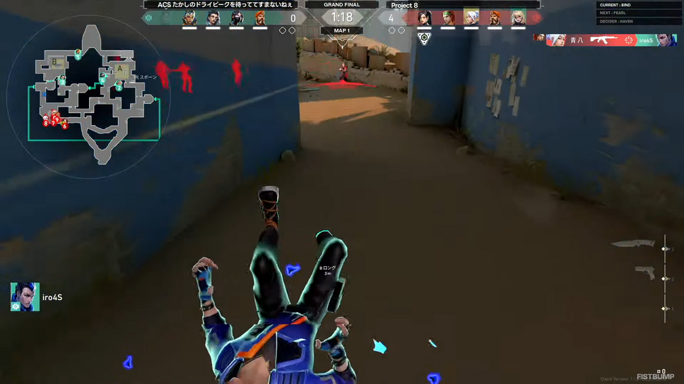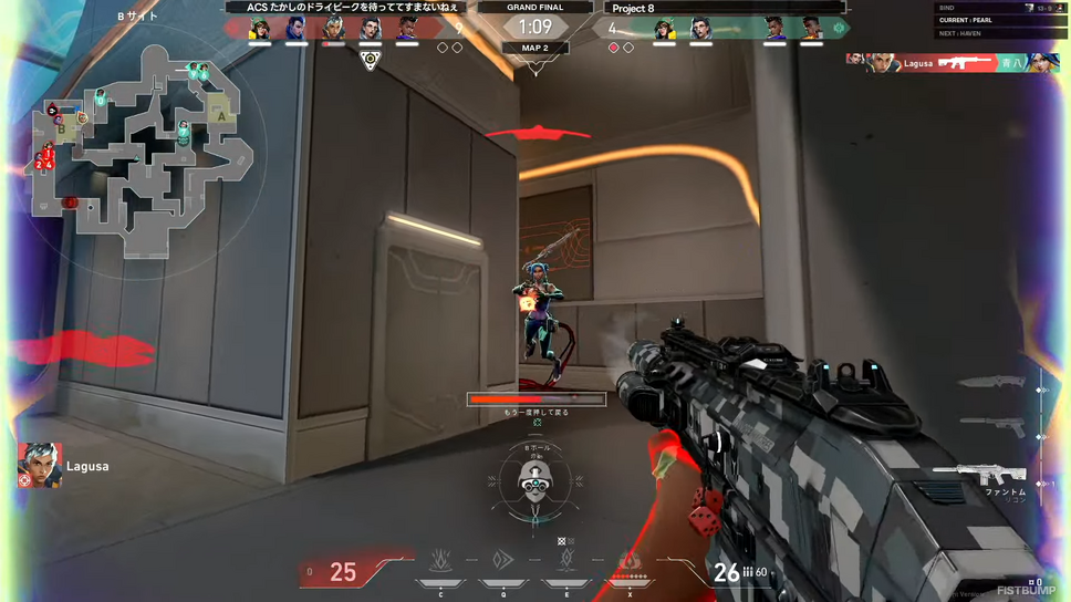 1stマップ:バインドは、セージのバリアオーブを使ったプラント設置からデッドロックの長所を生かし、堅実にサイトを守った「Project 8」がラウンドスコア:13-9で取得。スクリムでキルを量産していたローレン・イロアスさんのオペレーターを、スカイのフラッシュとジェットの前ブリンクを合わせて封じ込める場面などもあり、「Project 8」は構成の強みを存分に生かした戦い方で1stマップを制しました。