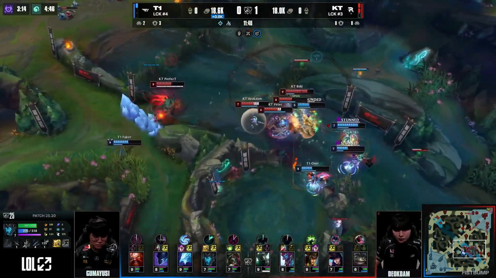 Game2は一転、KTが攻勢に。T1がドラゴンコントロールでリードする展開となりますが、KTはタワーを中心にゴールド有利を築く形で対抗し、Bdd選手が早々にピックしたメルを軸にスノーボールに成功。最後はオールインファイトとなりましたが、ヘクステックソウルの恩恵を受けたKT PerfecT選手のレク=サイがフロントを張ってネクサス破壊まで辿り着き、1-1のタイスコアに。
