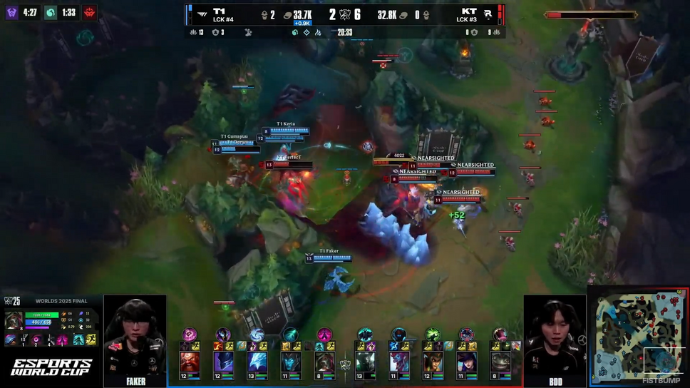 Worldsのグランドファイナルを彩る盛大なセレモニーで幕を開けた決勝で先手を取ったのはT1。Game1ではファーストブラッドこそKTのBdd選手に献上しますが、集団戦になるとT1が連携力の高さを見せつけ、KTの狙いを打ち砕くファイトを繰り返し大きくリード。丁寧にオブジェクトを取る盤石の試合運びで、完成度の高さを印象づける勝ち方で1-0とします。