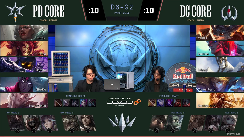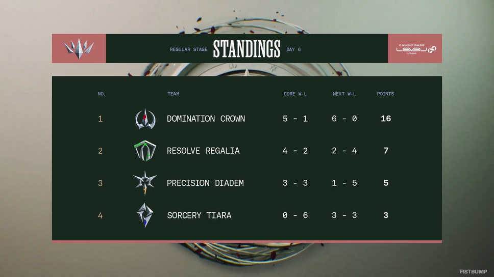Day 6では、1試合目に「Precision Diadem(PD)」と「Domination Crown(DC)」が対戦。DCが2連勝を飾り3ポイント獲得しました。2試合目には「Sorcery Tiara(ST)」と「Resolve Regalia(RR)」が激突し、1-1の引き分け。両チーム1ポイントを獲得しました。