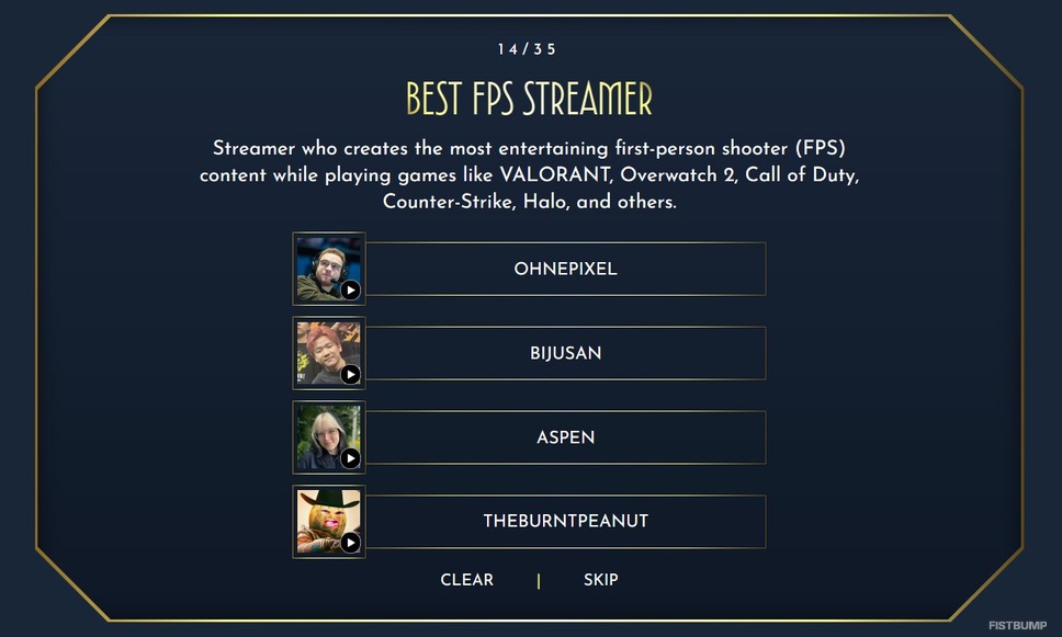 Bijuさんは「最も面白いFPSコンテンツを作成するストリーマー」を選ぶ「Best FPS Streamer」にノミネート。ノミネートページにリンクされたクリップは、今年2月に加藤純一さんらとプレイした『VALORANT』にて、「ここ2年で最も良いプレイ」と評されたBijuさんの華麗なACEです。