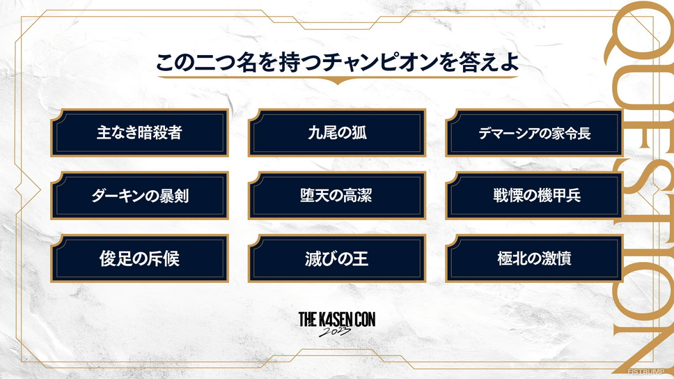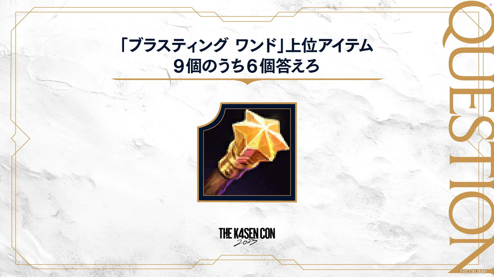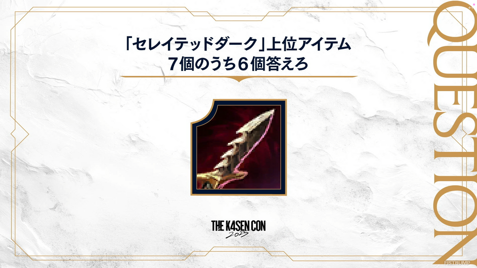 続く、2つ目のテストは記述や早押しで答える「LoL雑学クイズ」。このテストでは、指定されたアイテムビルドの合計ゴールドを答える計算問題や各チャンピオンのスキルやセリフを当てる問題など、チームで話し合いながら答える問題が出題されました。