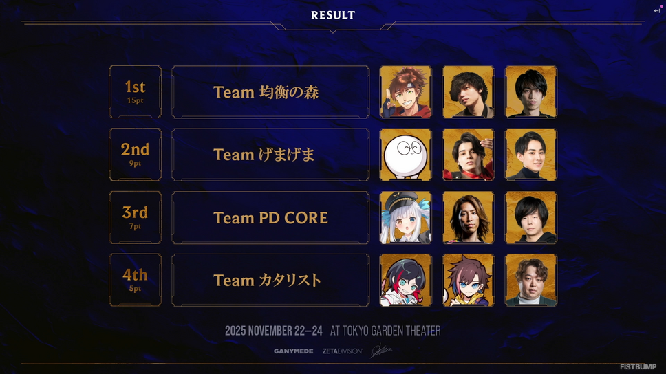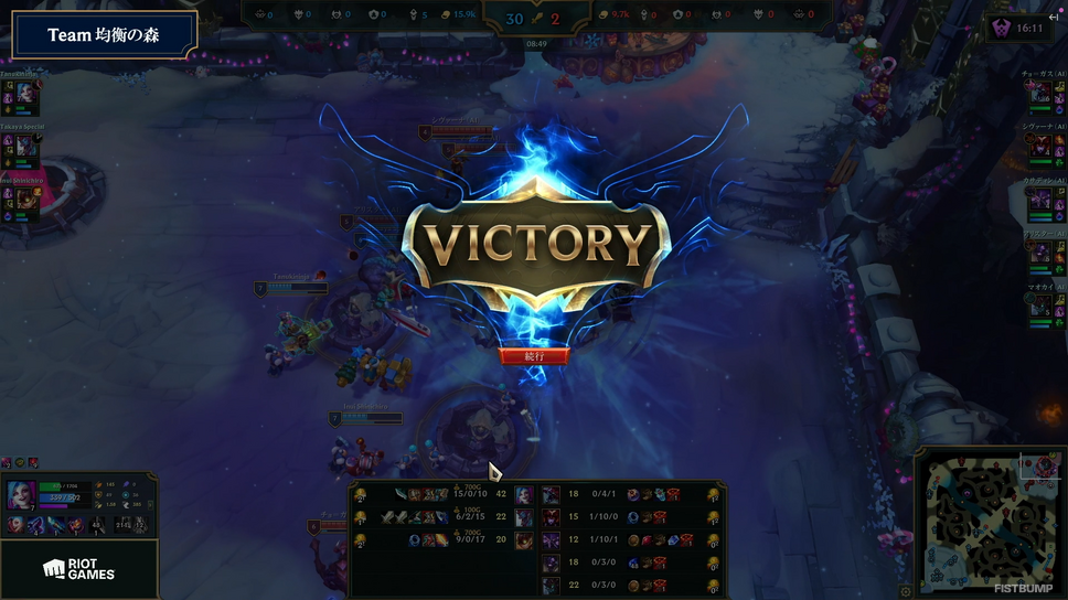 画像をみてチャンピオンを早押しで答える「LoL雑学クイズ」やAI戦の試合時間をリアルタイムで競う「AI戦RTA対決」などのテストが実施されるなか、たぬき忍者さん、たかやスペシャルさん、乾伸一郎さんを擁する「チーム均衡の森」が今までの『LoL』の経験を活かして優勝を収めました。