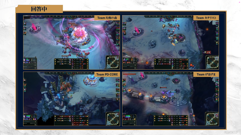 「LoL検定」では、総勢12名のストリーマーが「チーム均衡の森」「チームカタリスト」「チームPD CORE」「チームげまげま」の4チームに分かれ、『LoL』力を競い合いました。