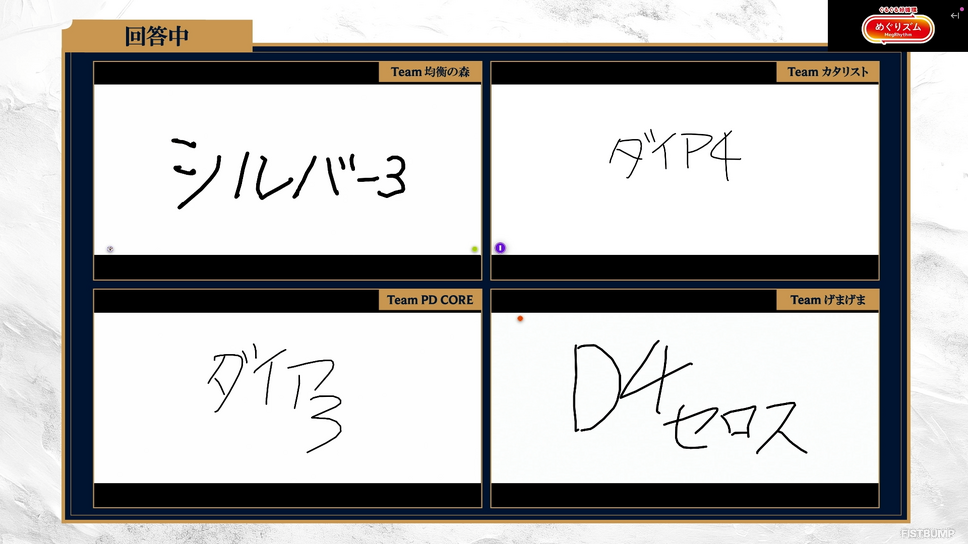 3つ目のテストで選ばれたのは、『LoL』のプレイを実際に見てプレイヤーのゲーム内ランクを見極める「ランク当て問題」です。エメラルドやゴールドなど様々なランクのプレイヤーが出題されるなか、最後には「チームげまげま」のスタンミさんのプレーが出題され、参加する4チームを翻弄。「チームげまげま」は「D4 Ceros」と答えましたが、惜しくも答えを外す結果となりました。