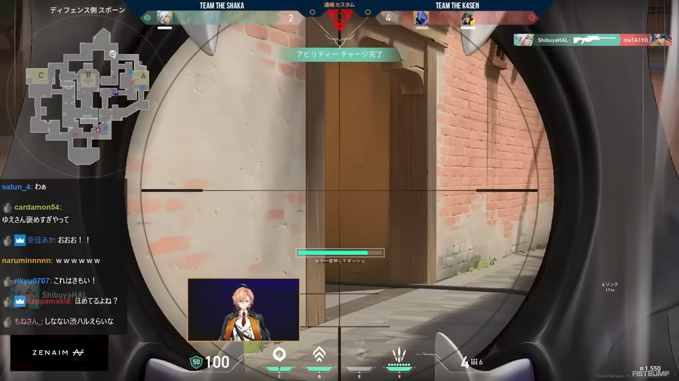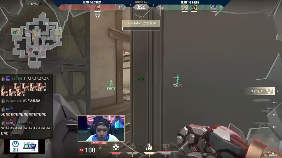 試合の前半では、「チーム・ザ・k4sen」がピストルラウンドを取得して好調な滑り出しをみせますが、「VTuber最協決定戦」などで『VALORANT』の練習相手をしていた「チーム・ザ・SHAKA」の渋谷ハルさんがジェットで16キルを獲得する活躍で食らいつき、6-6の折り返しとなりました。