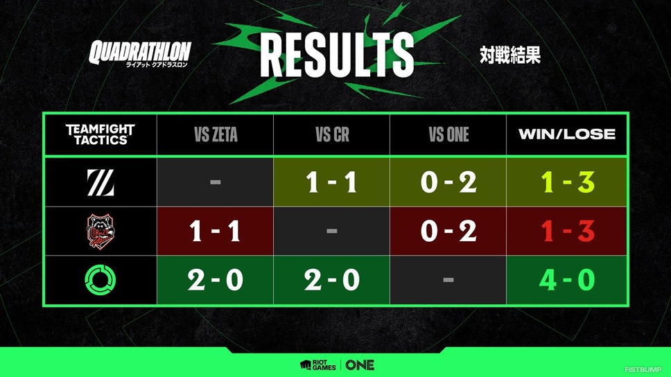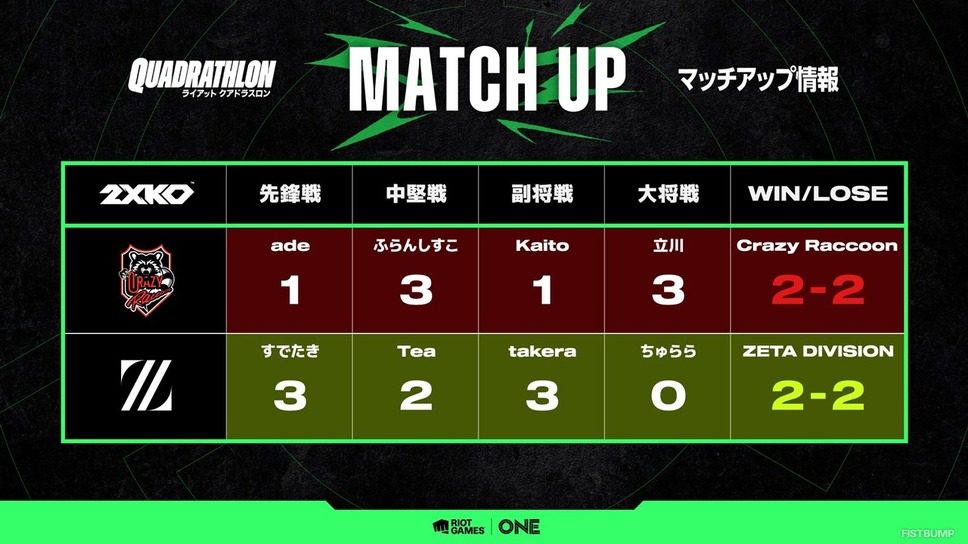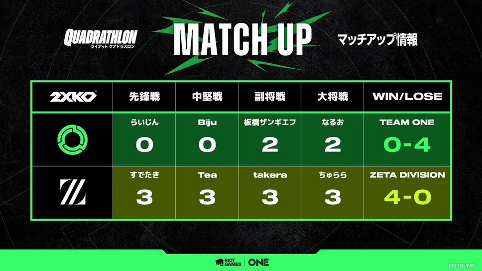 ZETA DIVISION、Crazy Raccoon、そして本企画のために結成されたTEAM ONEの3チームに分かれ、『リーグ・オブ・レジェンド』 、『VALORANT』 、『チームファイト タクティクス』 、『2XKO』 の4タイトルで三つ巴の戦いを繰り広げ、TEAM ONEが優勝を収めました。最終種目となったDay3の『VALORANT』では、ZETA DIVISIONがTEAM ONEを13-0で下したのち、第二マップの最終ラウンドではラプラス・ダークネスさんがLazさんを倒す劇的な幕引きとなりました。