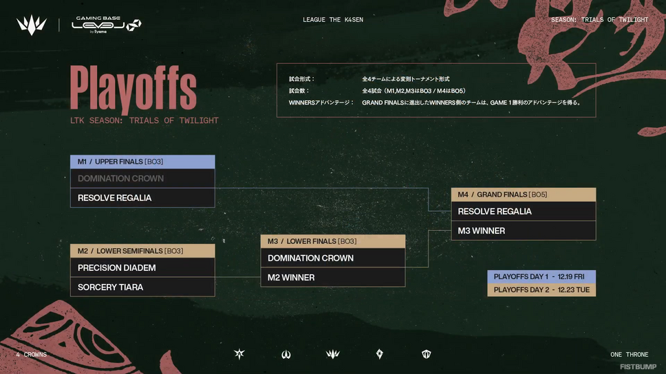 「League The k4sen(LTK)シーズン:黄昏の試練」のプレイオフ Day 1が12月19日(金)にオンラインで開催。レギュラーステージ1位通過の「Domination Crown(DC)」と2位通過の「Resolve Regalia(RR)」がアッパーファイナル(BO3)で激突。1戦目のNEXT戦ではDCがレギュラーステージ無敗の勢いそのままに勝利、2戦目のCORE戦ではRRが意地を見せ、1-1に追いつきます。
