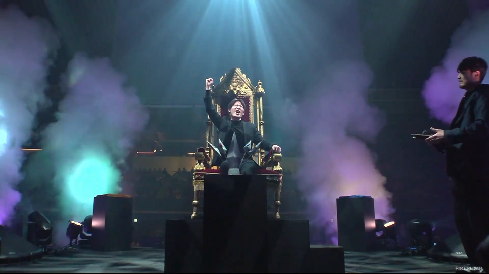 最後は全チームが壇上に揃い、それぞれ挨拶。最後にはRRを代表し、COREのJGとして半年間戦い続けたKHさんが4つのピースを集めて1つの王冠を作る恒例の儀式を行い、たった1つの玉座に座り、大きく拳を突き上げました。
