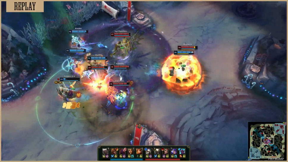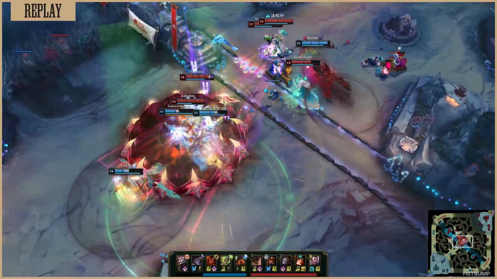 中盤にもキルを積み重ねたDCが逆転に成功すると、バロンも獲得するなど遂にDCの勝ちパターンに入った……かに思われましたが、MIDでのファイトでRRが4つのアルティメットを連鎖させる完璧なウォンボコンボに成功。6カ月チームを共にしたTOP・MID・JGのラインで息の合ったエンゲージで相手を崩壊させると、最後の集団戦も見事なコンボが決まって勝負あり。