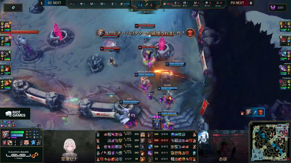 続くGame2はNEXT戦。ここまで高い勝率を誇るDC NEXTはJGのゆふなさんに新チャンピオンのザーヘン、そしてMIDの空澄セナさんの得意ピックであるアカリを持たせた強気なピックを展開。対するPDは先ほど勝利した試合と同じくJGリリアに、ユナラ&レナータ・グラスクのコンビで対抗します。