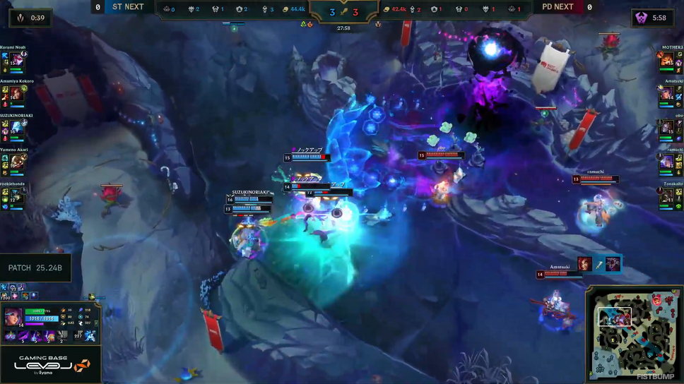 試合は20分時点で僅か3キルとお互い慎重な動きになりますが、TOPの胡桃のあさんにヴェインを持たせるドラフトで勝負に出たST NEXTがドラゴンスタックで先行して徐々にリードを取ると、バロンラッシュを敢行。これに成功して逃げ切ったかに思えましたが、PD NEXTのMIDおぼさんによるオリアナのフラッシュインRが炸裂し、形勢は逆転。その後は天月さんのリリアRを起点とする集団戦を決め、PDが先に1勝を挙げます。