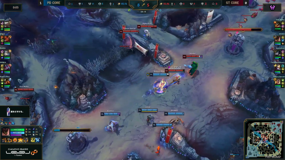 Game1、連勝を狙うPD COREはmittiiiさんに“先出しヴァルスTOP”を持たせる大胆な作戦に出ると、対するDC COREのTOPゆきおさんもジェイスで応じる構図に。試合はDCがリリア&セラフィーンの得意ピック合わせで先手を取るも、ヘラルドを巡る攻防でヴァルスが躍動し、一気に逆転に成功。その後は何度もキルが起こりながらも激しいトレードとなり、試合を決定付けるまでには至らず膠着状態に。