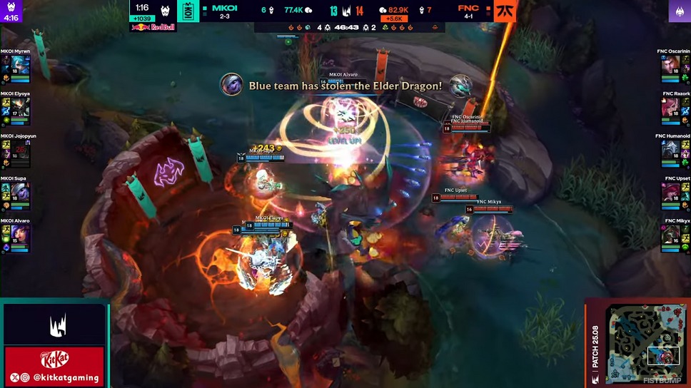 続いては「バックドアと言えばLEC」と評されることもあるほどインヒビター破壊後のマクロでの揺さぶりが定番となっている、欧州リーグ・LECからピックアップ。Spring Splitの「Movistar KOI(MKOI)」と「Fnatic(FNC)」のBo3は、1-1でGame3へと突入。ジワジワと有利を築いたFNCがドラゴンソウル獲得&7,000ゴールド差と圧倒的にリードしますが、MKOIも隙を突いてバロンを獲得すると、エルダーファイトでもスティールに成功し、一気に巻き返します。