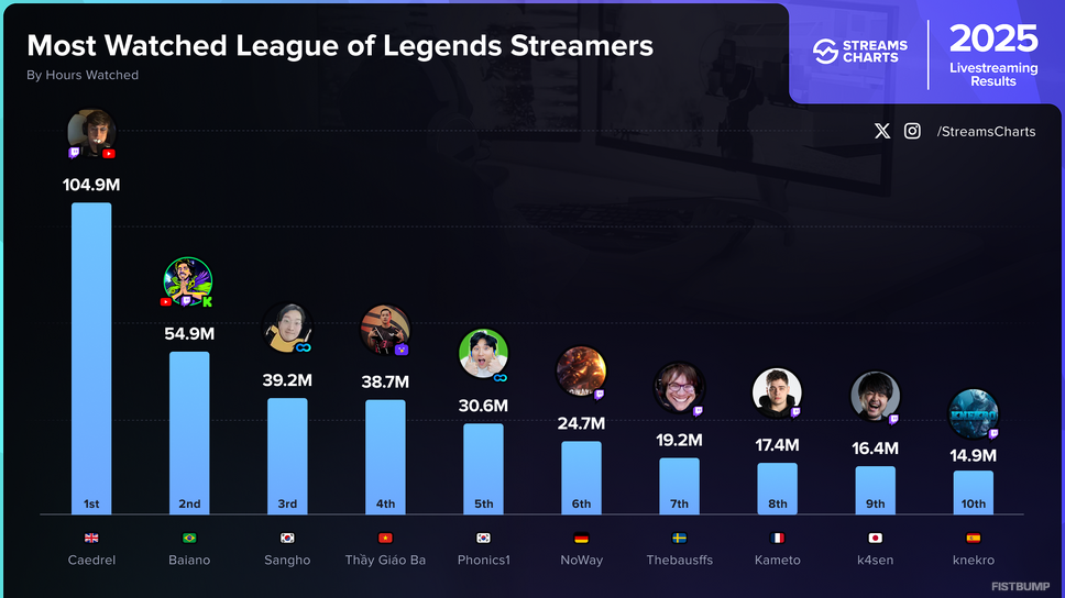 ライブ配信データの分析を行う「Streams Charts」は、2025年の『リーグ・オブ・レジェンド』カテゴリにおけるストリーマー視聴時間ランキングを発表しました。