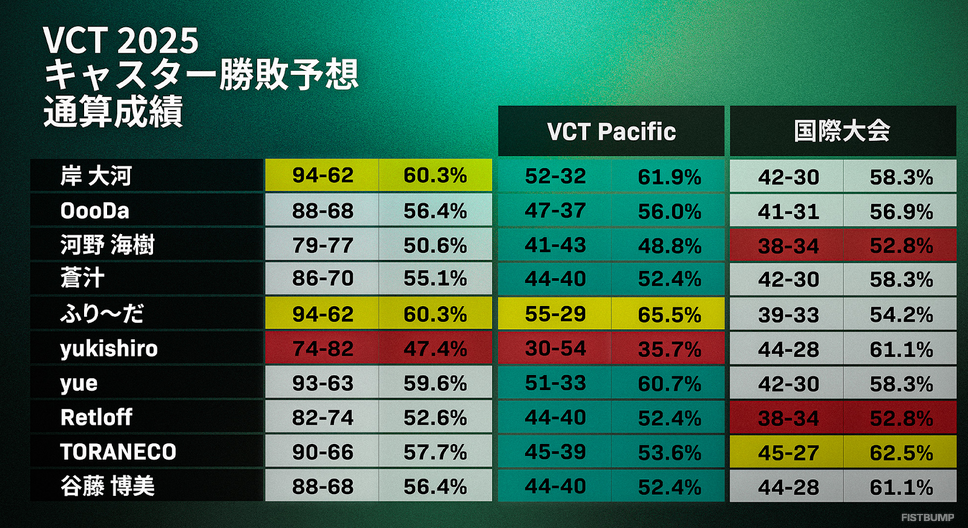 ――今年はキャスターの勝敗予想も盛り上がりました。Stage 1からChampionsまでのデータを集計すると岸さんが的中率1位でした。