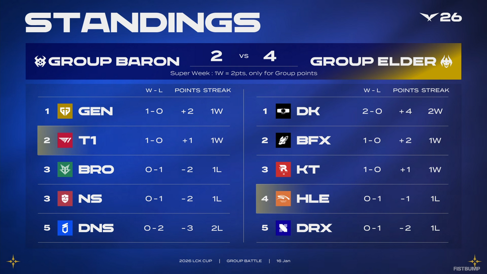 T1が勝利したことにより、同チームが所属する「グループ・バロン」は通算2勝目を獲得。一方、敗れたHLEの所属する「グループ・エルダー」は4勝のまま足踏みする形となり、リードをさらに広げることは叶いませんでした。