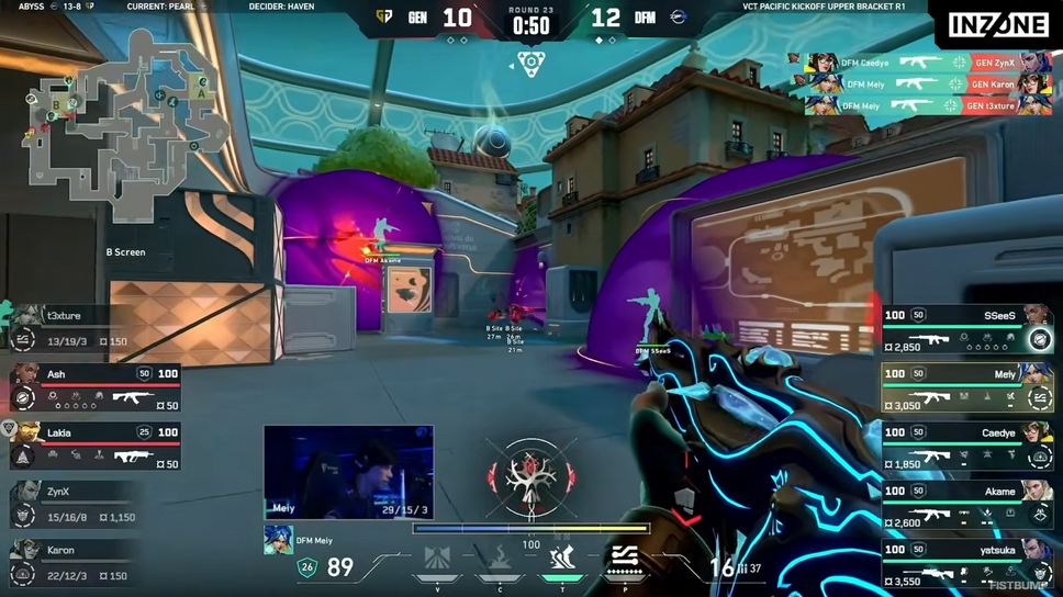 この日、初陣を迎えた「DFM」は韓国の強豪「Gen.G」と対戦。1stマップ「アビス」では、Masters優勝経験を持つGen.Gを相手に主導権を握り続け、ラウンドスコア13-8で先勝。続く2ndマップ「パール」では、Gen.Gが7-5とリードして前半を折り返すも、DFMが後半のピストルラウンドを制して食らいつき互角の展開となりました。勝敗の行方が読めない状況のなか、DFMが先にマッチポイントへ到達。そのままラウンドを3連取する形で勝ち抜き、初戦を白星スタートで飾りました。