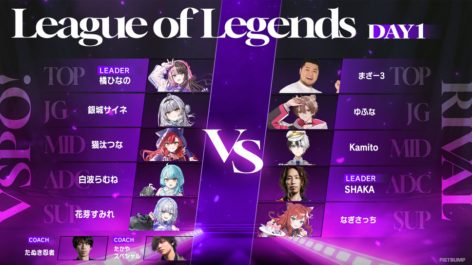 今回の「VSPO! SHOWDOWN」では2日間にわたって『リーグ・オブ・レジェンド』が開催されます。ぶいすぽっ!チームは「LTK(League The k4sen)」でも活躍した橘ひなのさん、千燈ゆうひさんが各チームのリーダーに抜擢。1月にぶいすぽっ!に加入した銀城サイネさん、龍巻ちせさんも出場します。DAY1のコーチはたぬき忍者さん、たかやスペシャルさんが担当。DAY2のコーチはしゃるるさん、yutaponさんが務めます。
