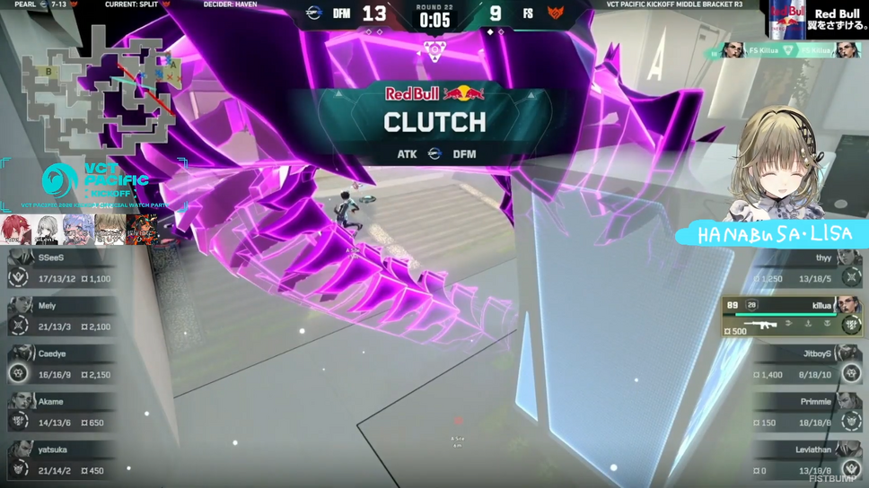 韓国・ソウルで開催されている「VCT Pacific Kickoff」Day10にてDetonatioN FocusMe(以下、DFM)は、FULL SENSEを相手にマップカウント2-1で勝利。この試合を視聴していたローレン・イロアスさん、英リサさん、夜乃くろむさん、蝶屋はなびさん、SiLenTさん、葛葉さんの6人は、「VTuber最協決定戦 Ver.VALORANT Act2(V最)」にてコーチを務めたCaedye選手やMeiy選手、Vorzコーチが所属するDFMに全力でエールを送りました。