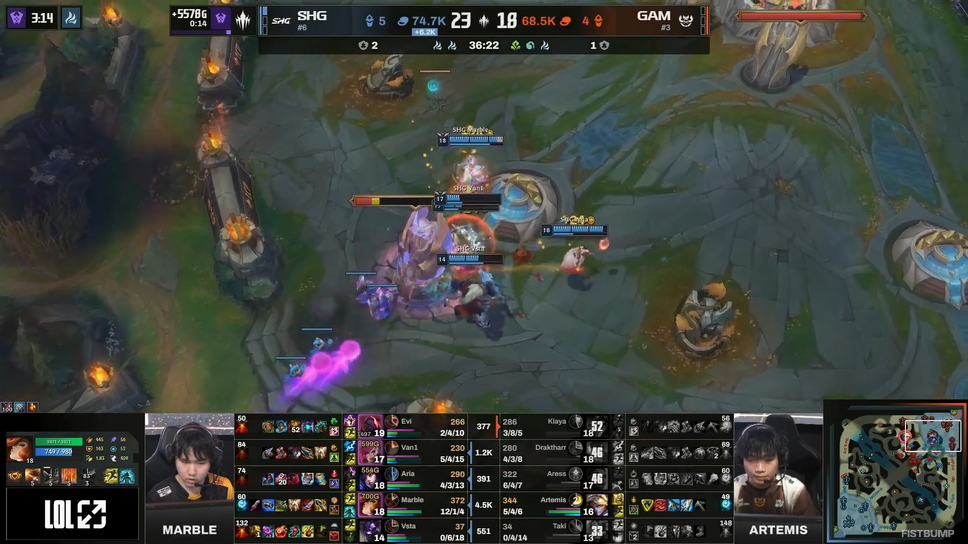 続くGame2ではヴァイ&アーリのコンボを狙うSHGに対してGAMはMIDメルでカウンター。さらにGAMはBOTデュオがタワーダイブを捌いて2キルを獲得するなど、18分段階で約4,700ゴールドの大きな優位を築き上げます。厳しいかに思われた試合でしたが、SHGは巧みな連携で遭遇戦での勝利を積み重ねていくと、30分過ぎに遂に逆転に成功。チーム全体で最後までディーラーのMarble選手を守り切り、立て続けの逆転勝利で2-0とします。