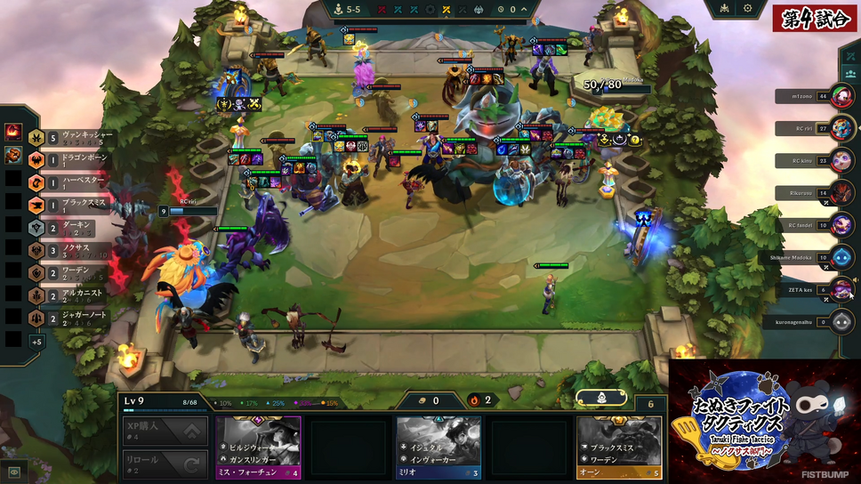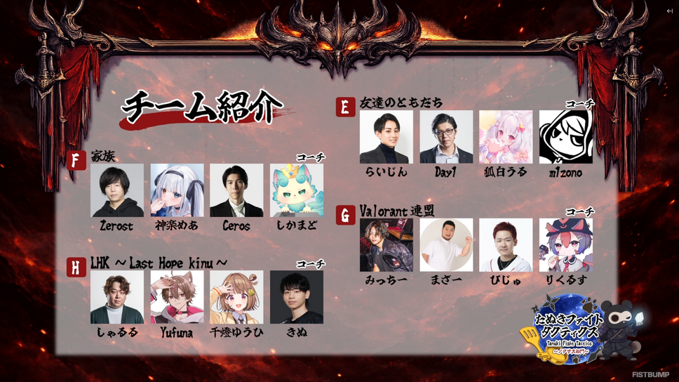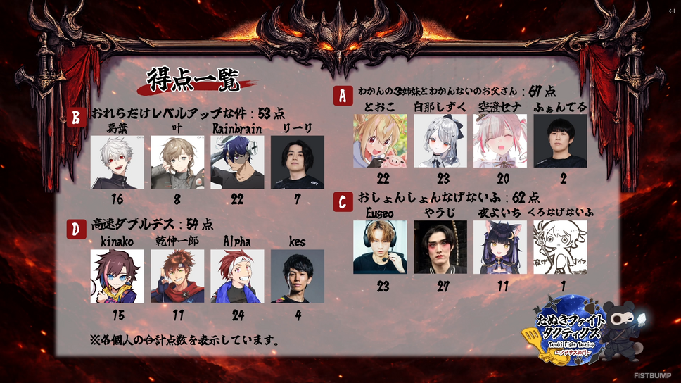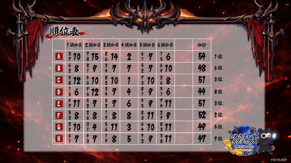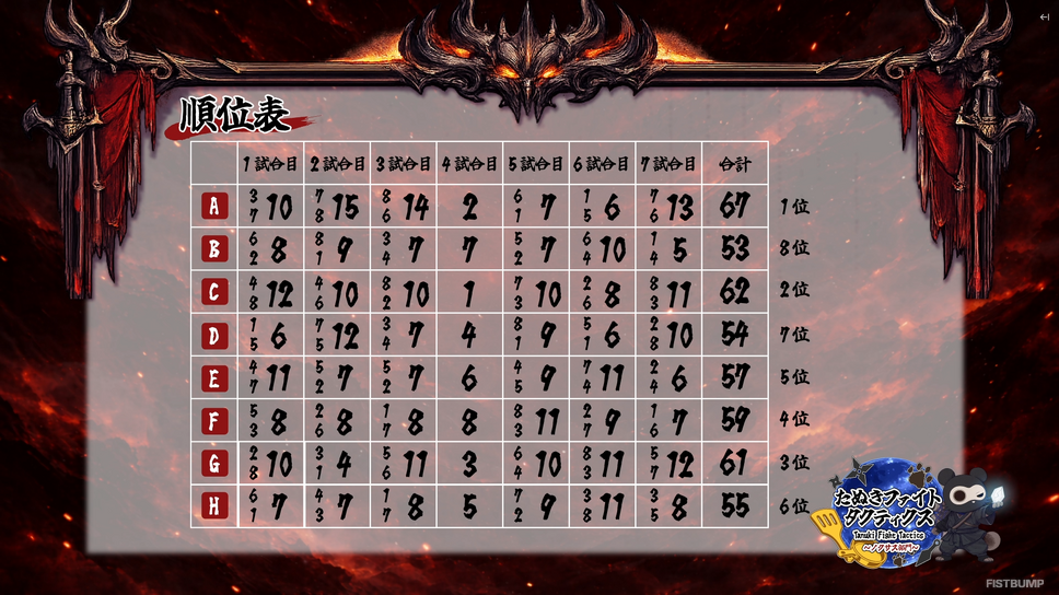 「わかんの3姉妹とわかんないのお父さん」は、試合序盤から10ポイント、15ポイント、14ポイントの計39ポイントを積み重ね、他チームにリードを広げながら首位に浮上。このまま三姉妹チームが独走かと思われましたが、4試合目に行われた各チームのコーチが出場するハイレベルマッチでZerostさんらのチーム「家族」のコーチを務めるしかめまどかさんが、体力8という瀬戸際まで耐え抜きながらイシュタル構成を完成させ、そのまま1位を獲得。続く5試合目では、Zerostさんが星3アンベッサを軸とした構成で1位を取得し、「家族」チームは首位の三姉妹チームとの差を5ポイントまで縮めました。