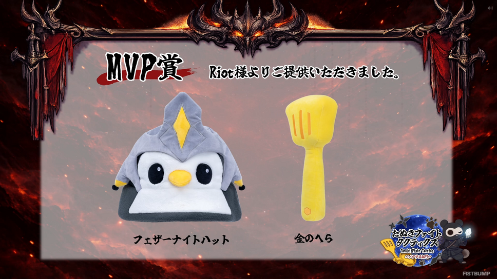 MVPには、練習期間中に約800戦をこなし、本戦でもチーム内トップの23ポイントを記録した白那しずくさんが選出。優勝者インタビューにて、白那しずくさんは「『TFT』初心者ということもあり、大会の出場が決まってから800戦以上の練習をしました。だいぶプレイしすぎたなと思います。」と、淡々とした口調で驚異的なエピソードを語りました。白那しずくさんには、MVP賞としてフェザーナイトハットと金のへらが贈呈されました。