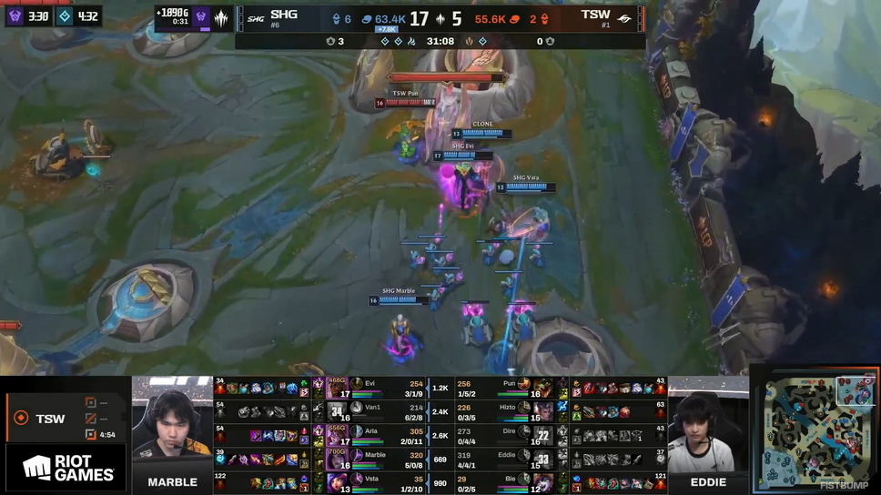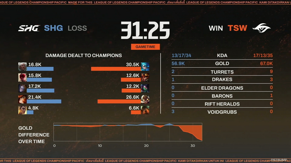 Round1で「GAM Esports(GAM)」を3-0で破った勢いそのままにGame1ではSHGが先行。遭遇戦の勝利から丁寧に試合を進めるとTSWの反撃を封殺し、鮮やかな試合運びで1ゲームを先取します。