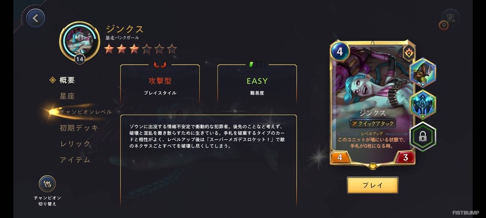 まずはジンクスからプレイ。ピルトーヴァーのお騒がせ者である彼女は、カードを使えば使うほど相手にダメージを与えられるというスキルを持っています。デッキ構成もアグロ寄りであり、低コストのカードが豊富です。