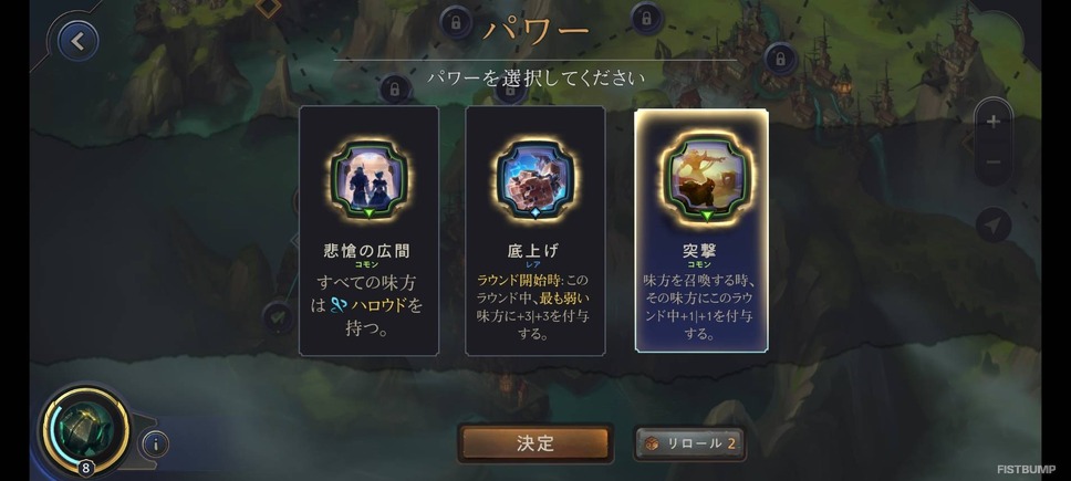 まず最初に「パワー」を選択。3つの選択肢から選び取ることができ、リロールも可能です。パワーはデッキ全体に関わるパッシブスキルであり、召喚された味方の体力に+1したり、手札のカードのコストを常に-1したりと、強力なものが揃っています。