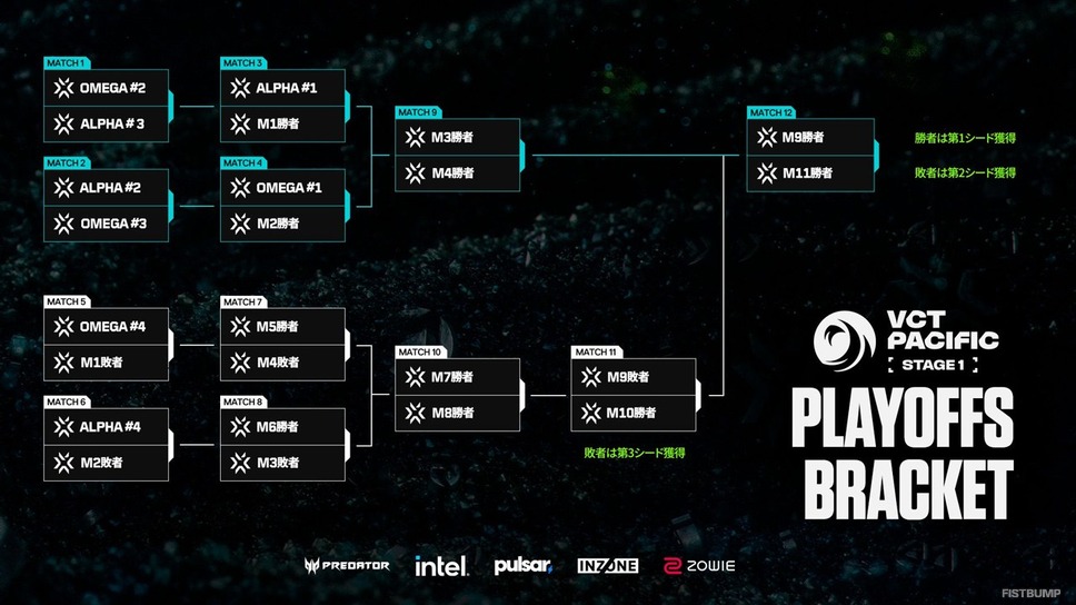 プレイオフはダブルエリミネーション形式(BO3、ロワー決勝およびグランドファイナルのみBO5)で実施。グループ1位のチームはアッパーブラケットでシード権を得る一方、各グループ4位のチームはロワーブラケットからのスタートという厳しい条件での戦いとなります。