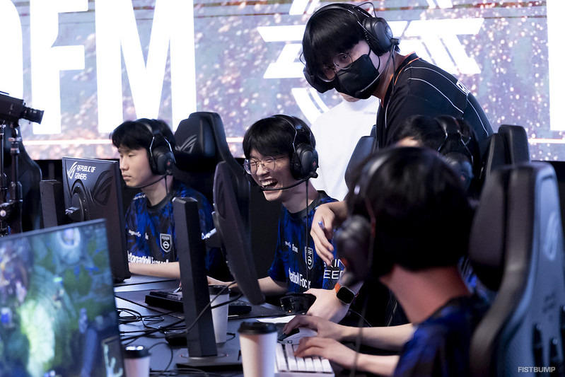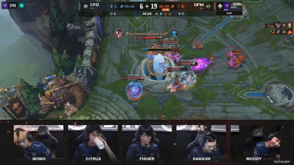 Game 1は序盤こそCFOが良い形で試合を進めるかに見えたものの、中盤からキルを獲り始めたDFMがストレートでドラゴンソウルを獲得。バロンも含めたオブジェクトのバフを土台に、まずは1勝を果たしました。しかしGame 2では先の試合と真逆の展開に。序盤良かったDFMでしたが、中盤の時間帯に主導権を握ったCFOがスノーボールを決めて勝利しました。