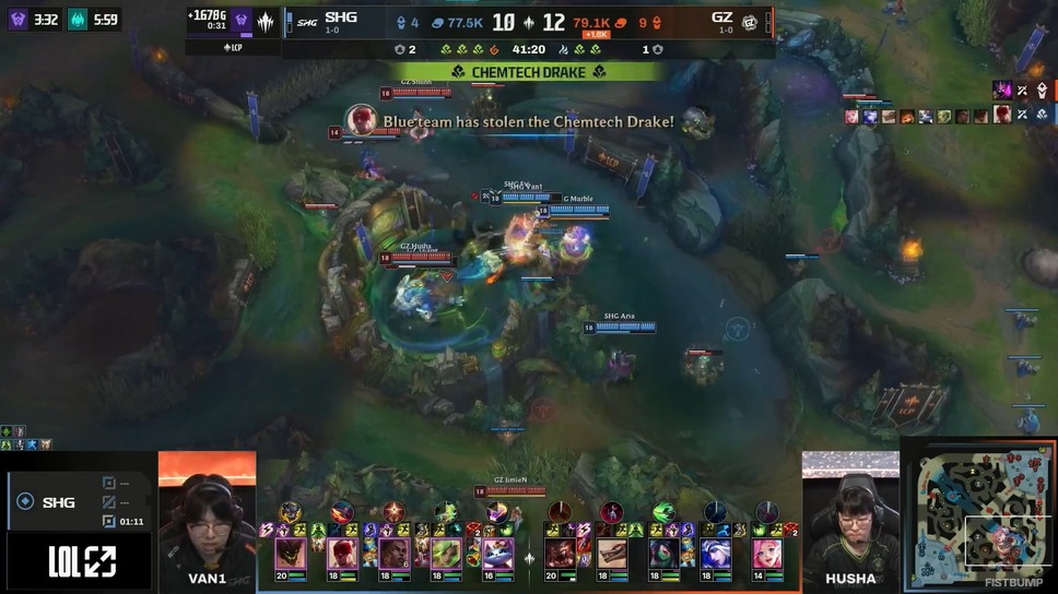 まずはGame 1、SHGがキルやドラゴンスタックで少しずつリードを築きます。そして迎えた終盤、SHGが相手をうまく各個撃破しバロンまで獲得。そのまま進軍したSHGが1戦目を制しました。続くGame 2では、序盤からGZが有利を握った状況で試合を展開します。インヒビターまで割られてピンチに陥ったSHGでしたが、少数戦での勝利、不利な状況下でのバロン獲得、ドラゴンソウルのかかったファイトでスティール成功などスーパープレイを連発。見事な逆転勝利を果たし、2-0でマッチの勝利をもぎ取りました。