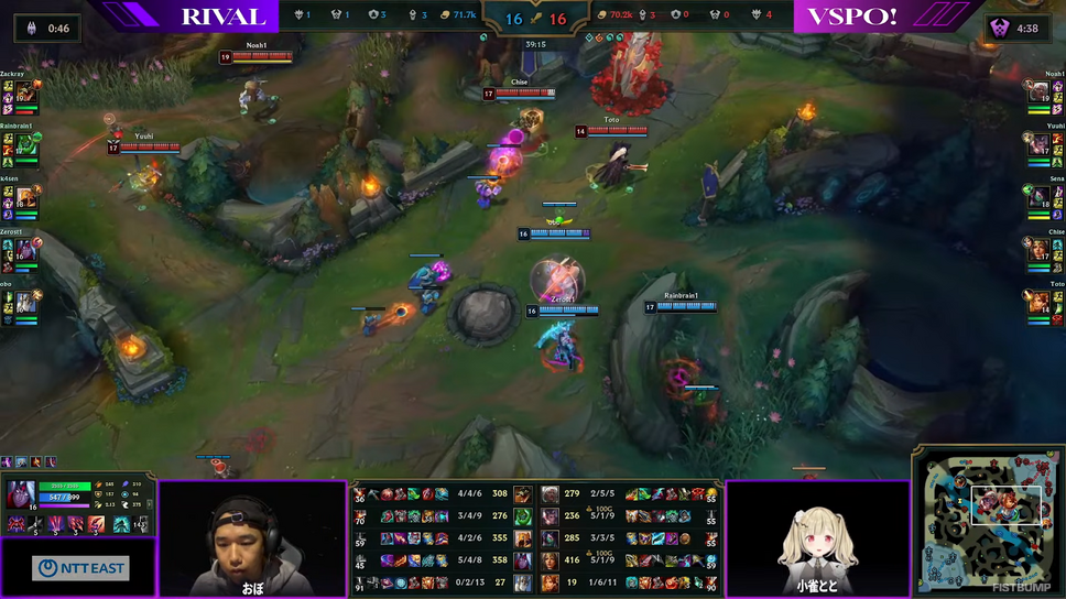 ――レーナーが苦しいとJGもその影響を受けるものですが、Game2は絶望で立ち止まってしまうことなく上手く巻き返していきました。その後「ぶいすぽっ!」チームはドラゴンをスタックしていくのですが、試合全体ではライバルチームも応戦して五分の展開になります。