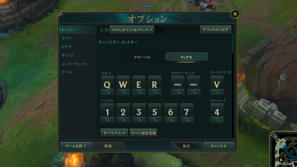 なお、チャンピオン別のキー設定はゲーム中にのみ変更できるので、何か変更しておきたいチャンピオンが思いついたらトレーニングモードで設定し、ついでに操作感も確認してみると良いでしょう。うっかり「グローバル」の設定を変えないようにだけご注意を。