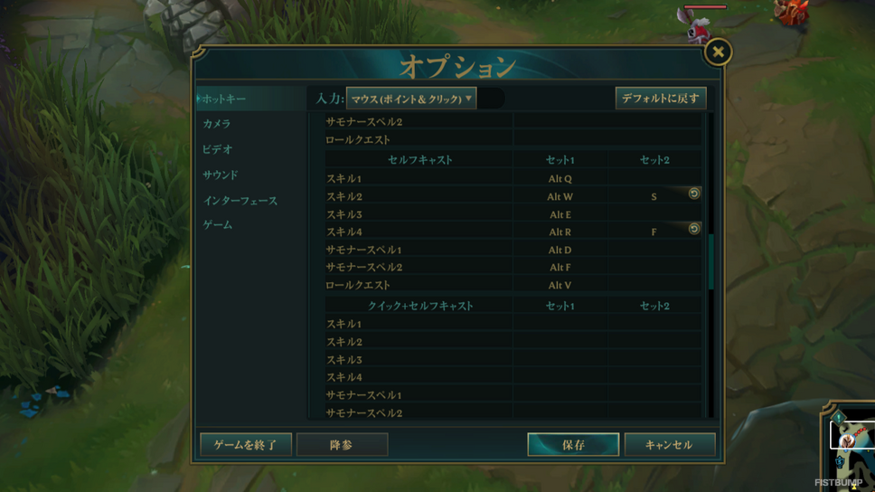 ケイルのRやリサンドラのR、カルマのE、オリアナのEなどを“自分を対象”にワンボタンで発動できるのがセルフキャストですが、初期設定の「Alt+スキルキー」は中々押しづらいもの。そこで「S」や「T」など普段あまり使用しないキーに「セルフキャスト」を割り振っておくことでサッと発動可能に。