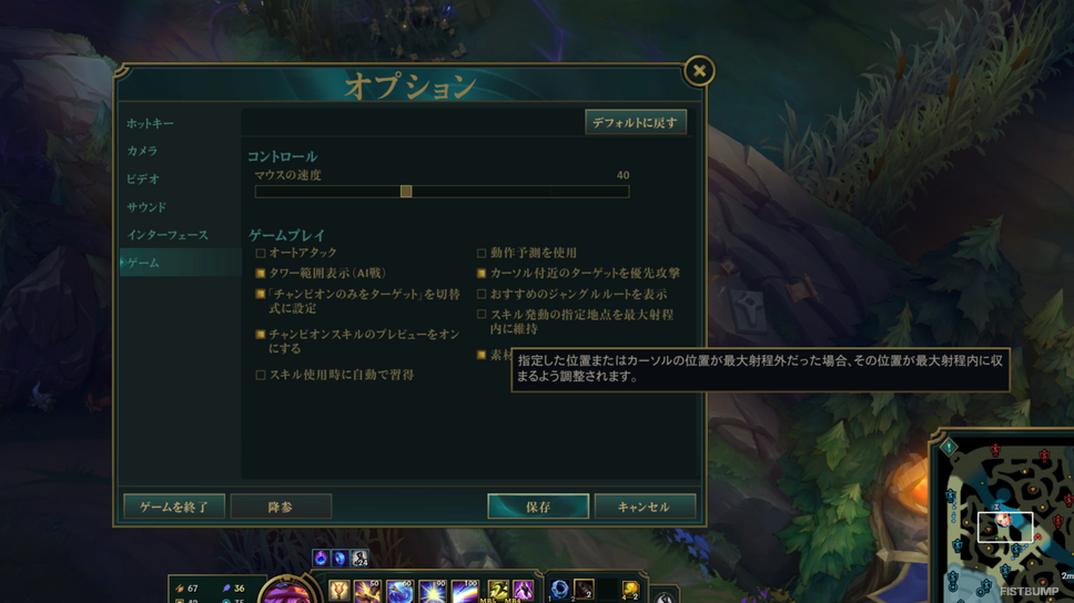 また、こちらはホットキーとは別の設定ですが、スキルで「範囲外を指定した時」には「チャンピオンが発動可能な範囲まで歩いて発動する」か、「その場の最大射程で発動する」のかも、実は設定の「ゲーム」欄から変更可能です。こちらもイメージよりも思わぬ前ムーブを防止したいか、思ったより短い範囲で発動してしまうケースを避けたいかで選びたいポイントです。