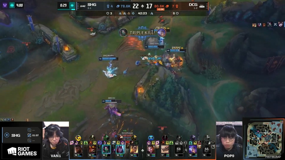 Game 1は序盤こそSHGがドラゴンを立て続けに獲得し有利に進むかに見えましたが、中盤以降は集団戦で勝ち続けたDCGがレーンを押し上げてリードを掴みます。苦しい戦いが続くなか、SHGは終盤の集団戦で3キルを獲得しそのまま相手陣営へ。きっちりゲームエンドまで決めきり、見事な逆転勝利を果たしました。続くGame 2では、SHGがラストピックでパイクを選択し勝負に出ます。ここでは序盤からキルを重ねたSHGが主導権を握り、きれいなスノーボールで試合終了。これにより2-0でSHGの勝利となりました。