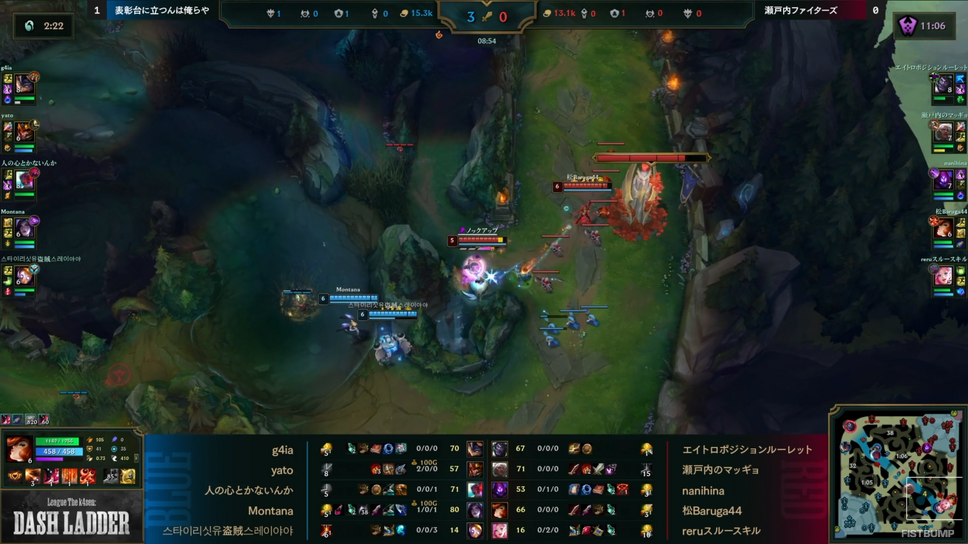 Game1は「HanPenDynamite」が接戦を勝ち切ったものの、Game2をラダーランキング上位の「BloodSugarSpike」が取り返し、決着はGame3へ。「HanPenDynamite」はBOTの「能天気ダイナマイト」選手とSUPの「はんぺん」選手がケイトリン&ニーコのコンビを選択し、レーンからのスノーボールを狙うと、この戦略をJGも絡めながらきっちりと成功させます。