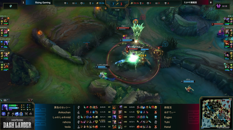 迎えたGame3では再び「たかや海賊団」がアニーとザーヘンを選択し勝利の再現を狙いましたが、「Rising Gaming」はMIDの「しゅわしゅわmid(Ramune)」選手にゾーイを持たせると、これが中盤から効果的に決まり、大きなリードに。懸命の集団戦で盛り返す相手を跳ねのけ、OBプレイヤーを前に「現LJL2位」の意地を見せつける勝利で優勝を決めました。